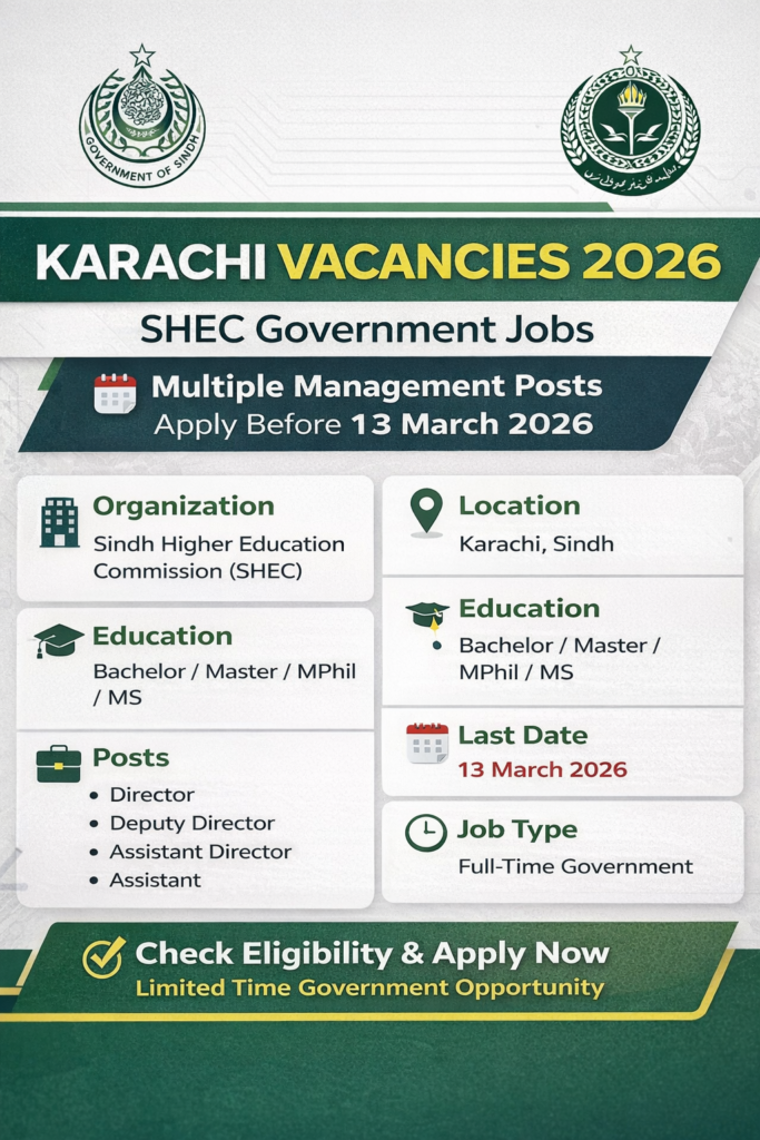 If you are searching for the latest Karachi vacancies, Sindh Higher Education Commission (SHEC) has announced multiple management posts in Karachi for 2026. These government Karachi vacancies include Director, Deputy Director, Assistant Director, and other administrative positions for qualified candidates. Interested applicants must apply before the closing date.